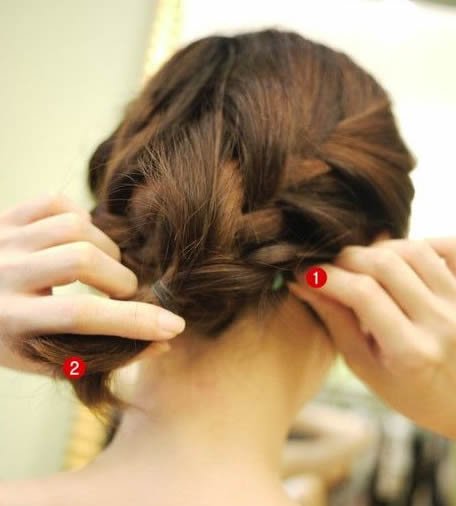 再把2号的发尾拉向1号的发根处,就像打叉一样的交叉。固定