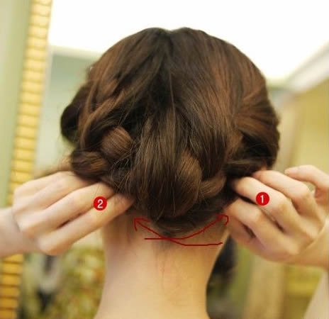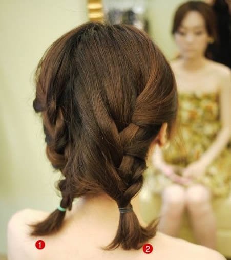 别急别急。到这一步还没结束呢,再来把两根辫子交叉。先把1号往2号的发根处收尾。用夹子固定