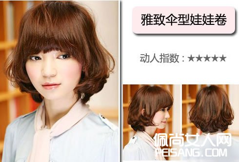 动人点评:圆形的内弯刘海,遮住了1/3的脸蛋,瞬间变成巴掌脸,加上脸颊旁的弯翘发丝,更加突出了温柔的眼睛以及红润的脸蛋。低层次的内弯娃娃卷,使发型呈现一个非常可爱的伞状外形,也增加发型下部的层次感,更丰富。